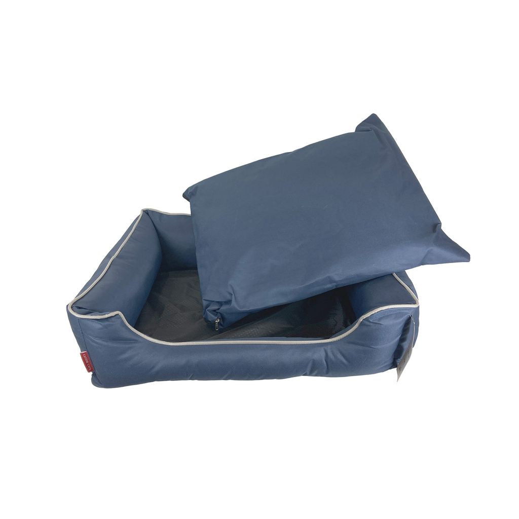 The classic navy colour makes it a practical and stylish addition to any home, while the plush materials offer warmth and comfort for daily use. Ideal for dogs that enjoy curling up or resting against supportive edges.