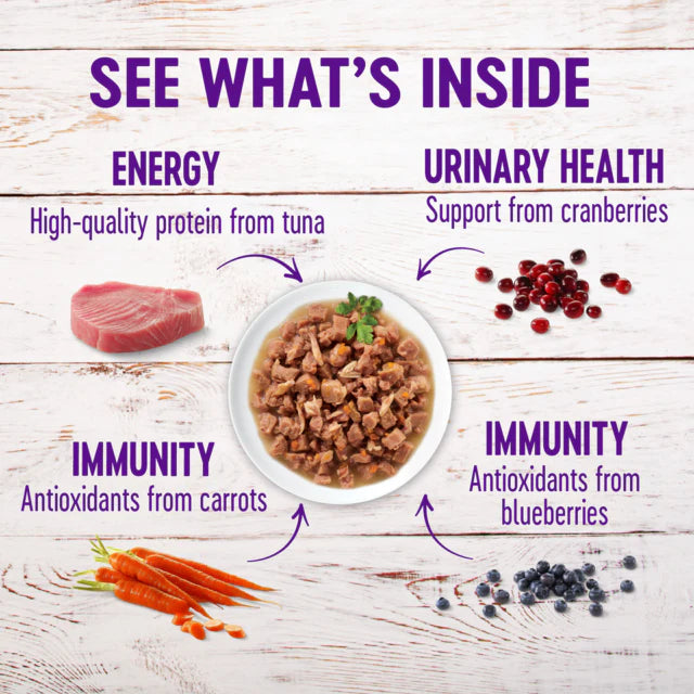 Chicken Broth, Water sufficient for processing, Chicken, Tuna Potato Starch, Eggs, Carrots,Chicken Liver, Natural flavor, Salt, Tricalcium Phosphate, Guar Gum, Potassium Chloride, Taurine, Magnesium Sulfate, Vitamins (Vitamin E Supplement, Thiamine Hydrochloride, Niacin, Vitamin A Supplement,Pyridoxine Hydrochloride, d-CalciumPantothenate, Riboflavin Supplement, Folic Acid, Vitamin D3 Supplement, Biotinn, Vitamin B12 Supplemen), Cranberries, Blueberries, White Sweet Potatoes, Xanthan Gum, Choline Chloride, Zinc Amino Acid, Chelate, Iron Amino Acid Chelate, Manganese Amino Acid Chelate, Copper Amino Acid Chelate, Potassium Iodide, Sodium Selenite.