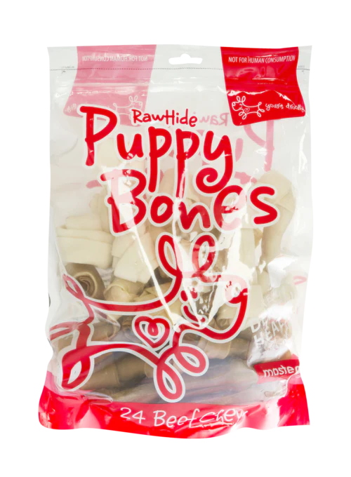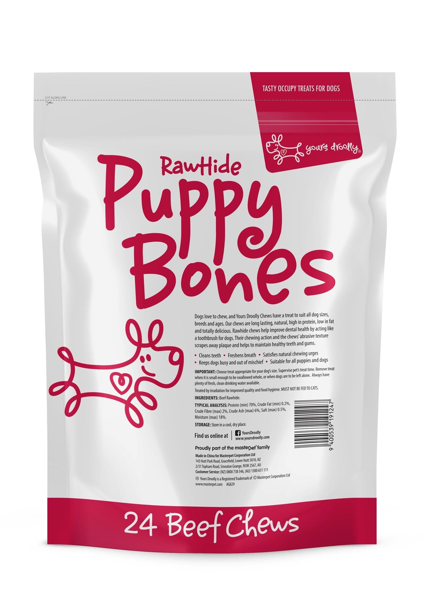 Yours Droolly puppy beef rawhide chews are a long-lasting, tasty chew that act like a toothbrush, with an abrasive texture helping to scrape away plaque and helping to satisfy natural chewing urges.